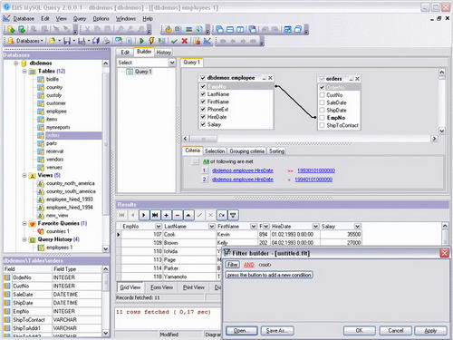 設置選擇標準等等。用戶可一次處理數個查詢,通過幾種模式編輯查詢,觀察運算結果,以